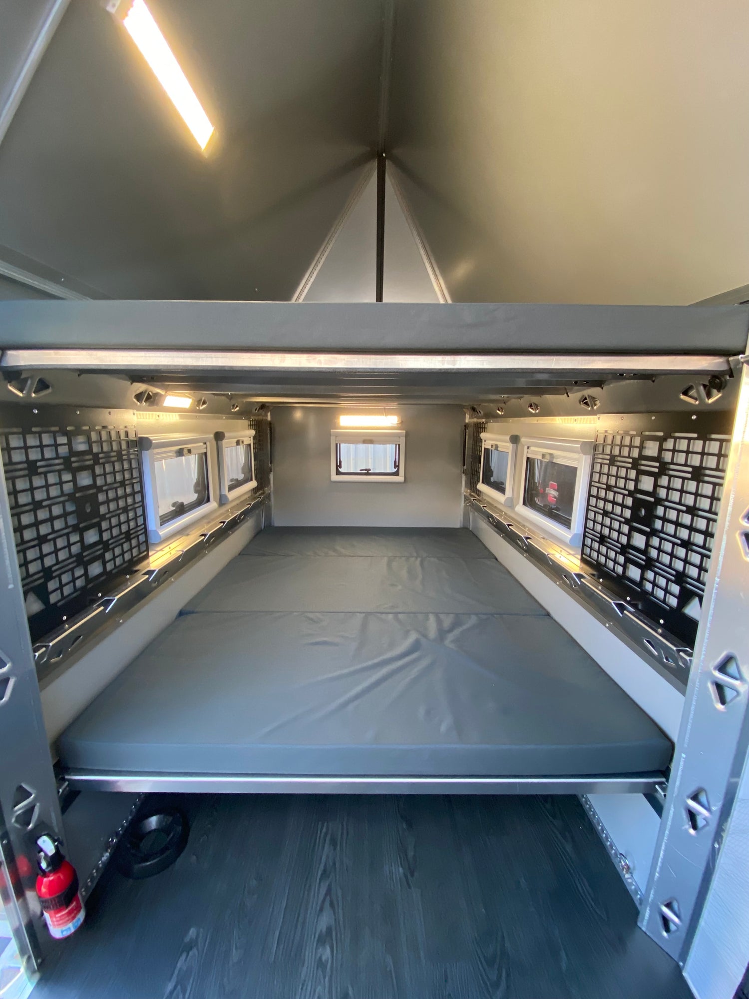 Camp Mode offers 9+ feet of headroom with two queen bunks. The queen beds are completely modular for hauling mountain bikes, motorcycles, and quads. The perfect basecamp with the space and refuge you need.